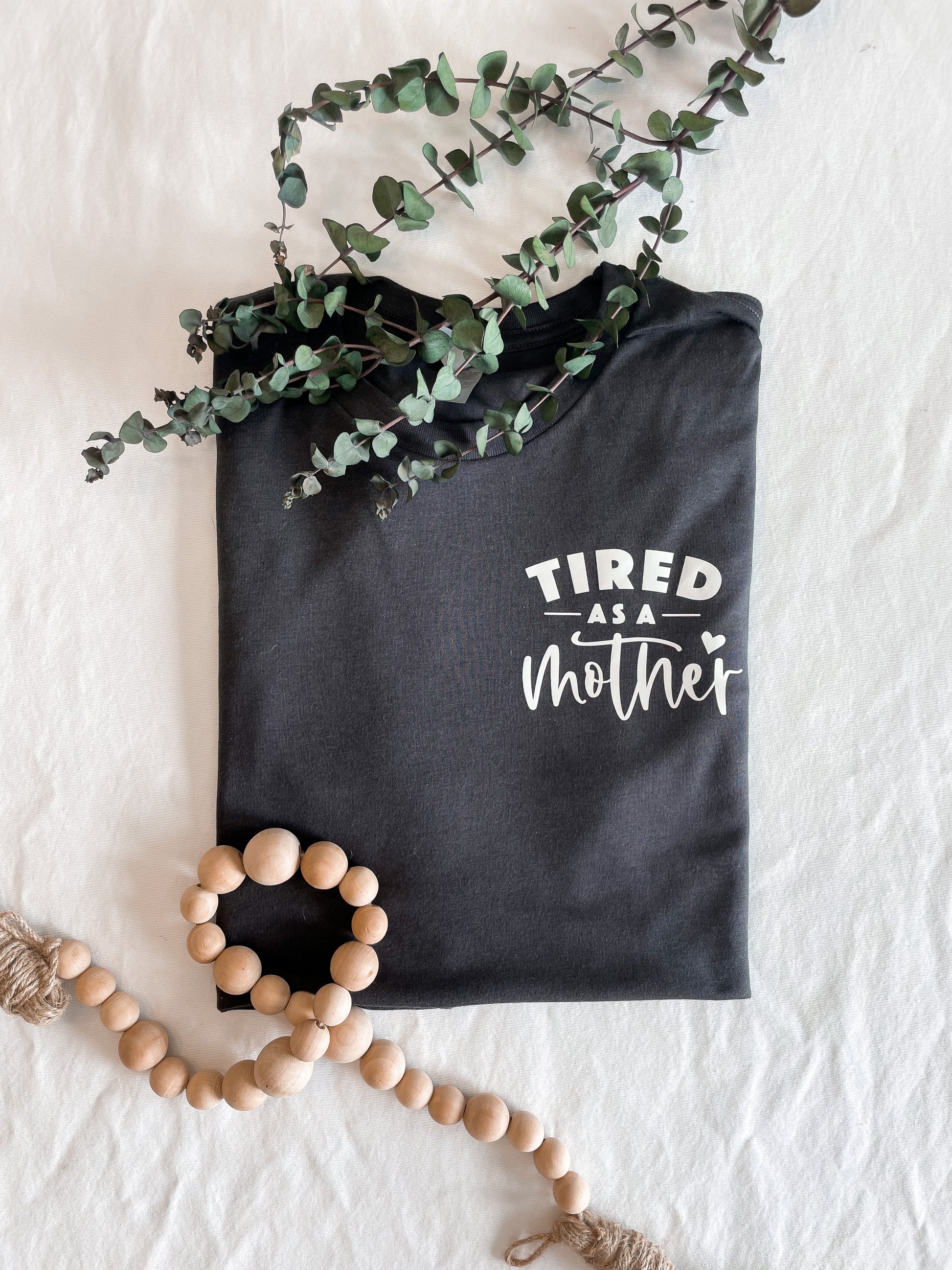 "Tired as a Mother" tee is the perfect tee for those mama's that are just plain tired! Show your sense of humor off with this cozy tee.